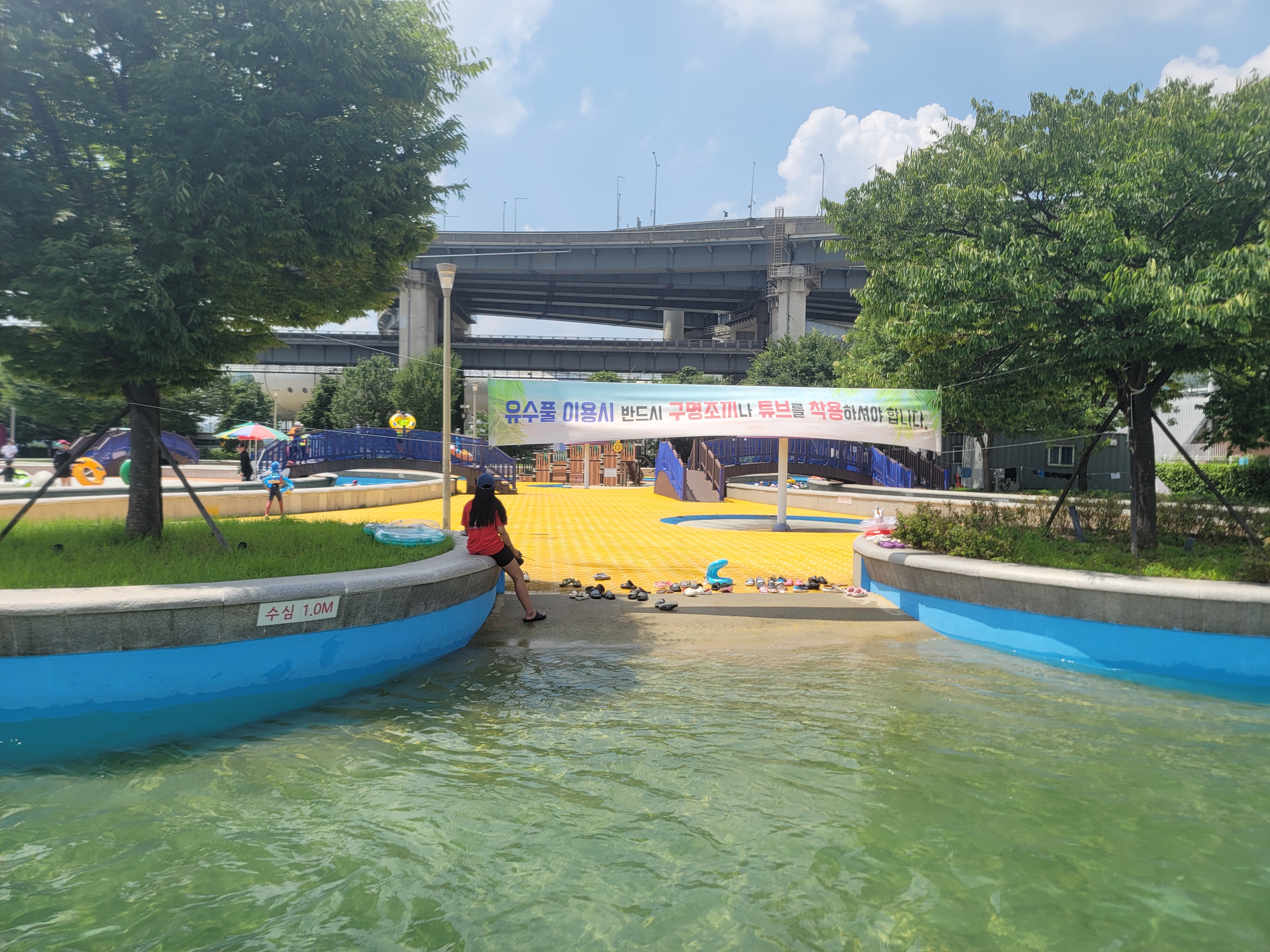 이곳은 유수풀이 있는데요. 들어갈 때 몇몇분들은 신발을 벗어놓고 들어가시더라구요. 신발 신고 들어가셔도 되구요. 구명조끼나 튜브를 착용하면 입장이 가능합니다.