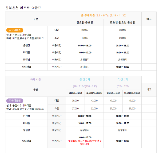워터파크 개장은 신북온천 싸이트에는 7월 1일부터 8월 28일까지라고 되어 있습니다.