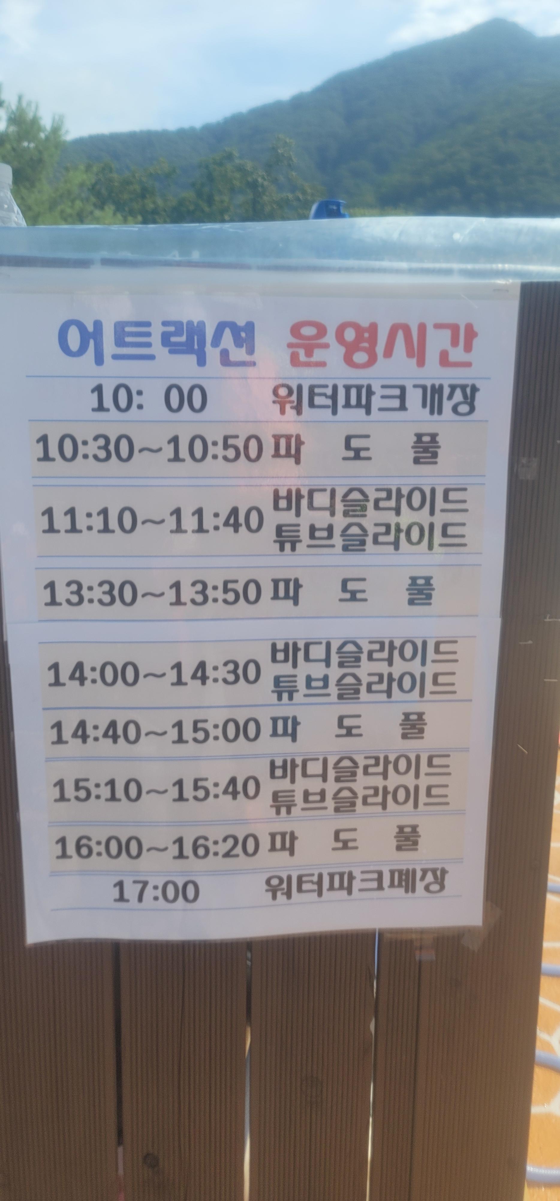 음...따로따로 운영시간이 있는게 아니고, 전체 시간표예요. 파도풀이 시작되면 바디슬라이드, 튜브슬라이드는 멈추고, 바디슬라이드, 튜브슬라이드가 시작되면 파도풀은 멈춘답니다....ㅎㅎ