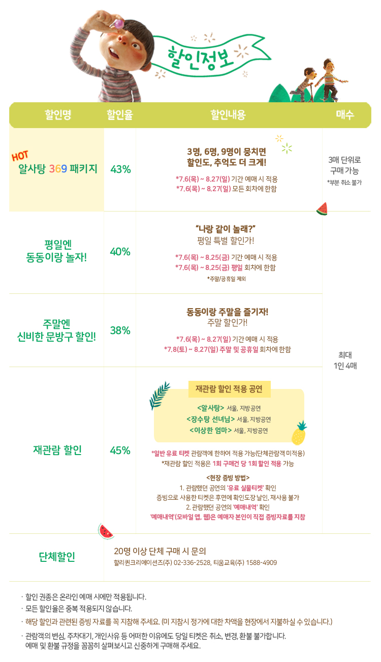 할인정보입니다. 장수탕을볼 때에는 369 패키지로 보았었는데, 이번에는 재관람 할인으로 해서 보았습니다. 이왕이면 369, 재관람이 가장 할인혜택이 좋은 것 같네요.