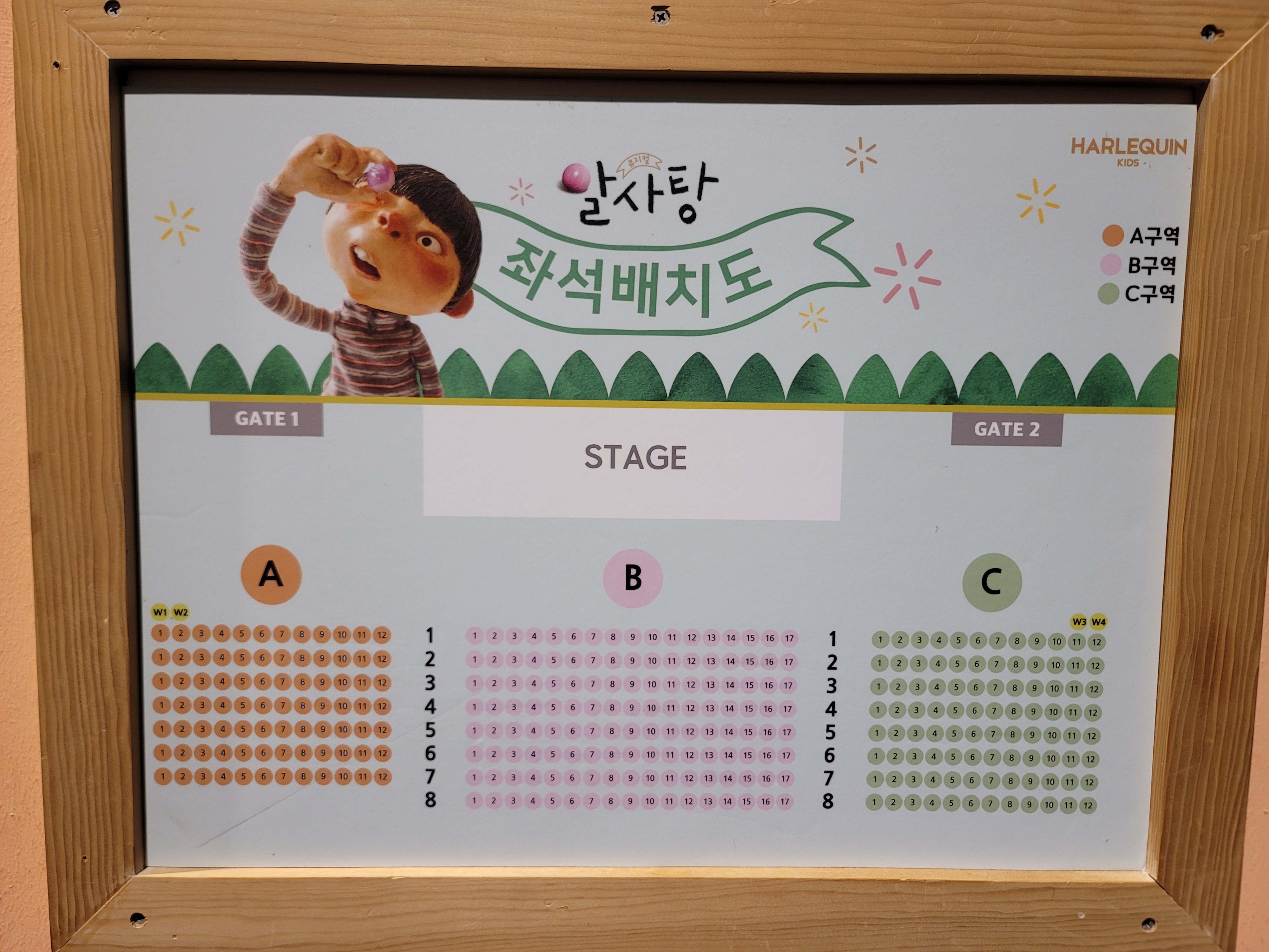 먼저 저희는 B열 맨 앞에 앉았습니다. 서울숲 씨어터 자체가 1관이든 2관이든 다 작은 사이즈의 소극장이기때문에 어딜 앉으시든 크게 문제는 없을 듯 보여요. 그런데 알사탕 공연 같은 경우는 앞에 비눗방울도 뿌리고, 꽃가루도 날리고 해서 앞자리가 아이들에게는 더 좋아 보였습니다.