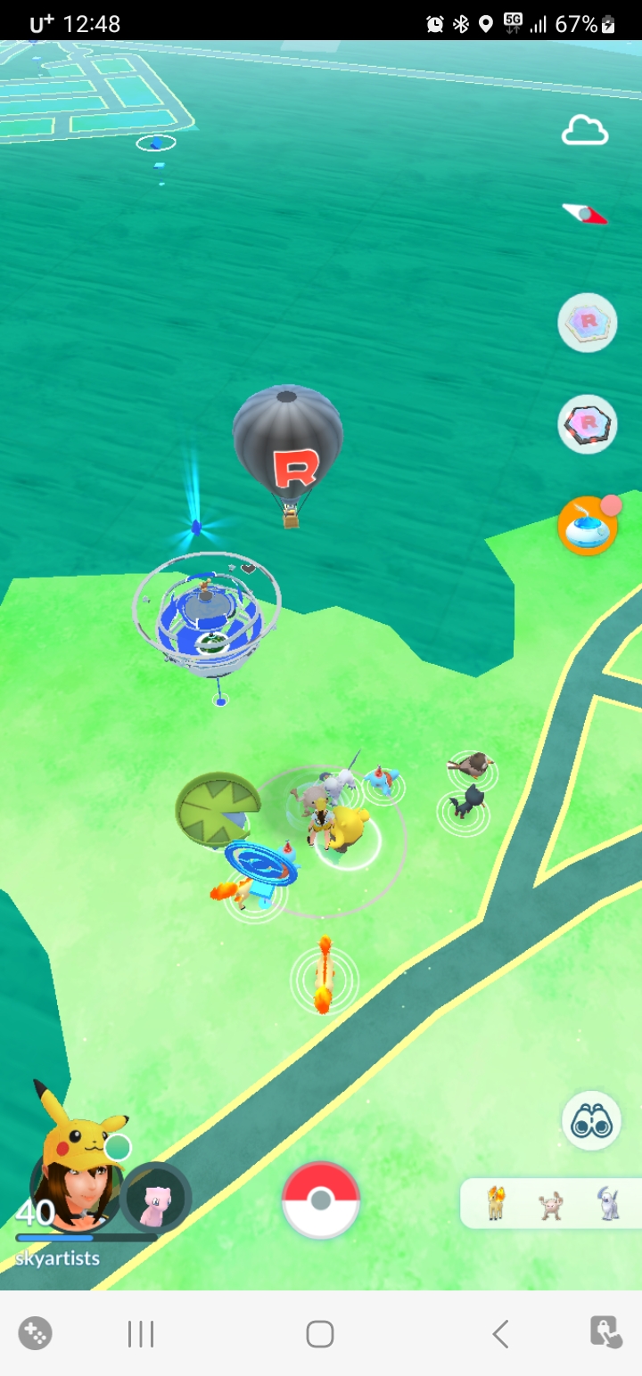 이렇게 열심히 걸어다니다 보면 체육관 위에 떠있는 알이 보이실 거에요. 그 알이 부화하면 체육관 레이드가 시작되는데요. 체육관에 나타난 몬스터 위에 난이도를 보시고 사람이 많이 참여중이면 들어가서 레이드 배틀하면 경험치도 많이 얻고, 레이드 몬스터도 얻을 수 있어요.
